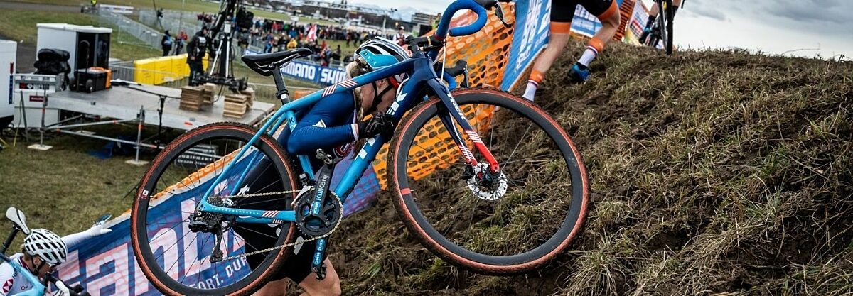 Cyclocross, often referred to as ‘cross or CX, is a sport that has its origins in Europe in the early 1900s. Since the cyclocross season generally takes place from September to February, adverse weather conditions such as snow, rain, wind, and mud often alter racing conditions. Cyclocross is kind of like a steeplechase, but on a bike, with courses that can consist of grass, dirt, mud, pavement, short, steep hills, off-camber sections and a few obstacles. Obstacles may include low, wood planks (called barriers), stairs, unrideable steep hills, or logs. These force the rider to get off and remount their bike multiple times a lap. These technical elements along with the unpredictable weather and course conditions all add to the sport’s allure.