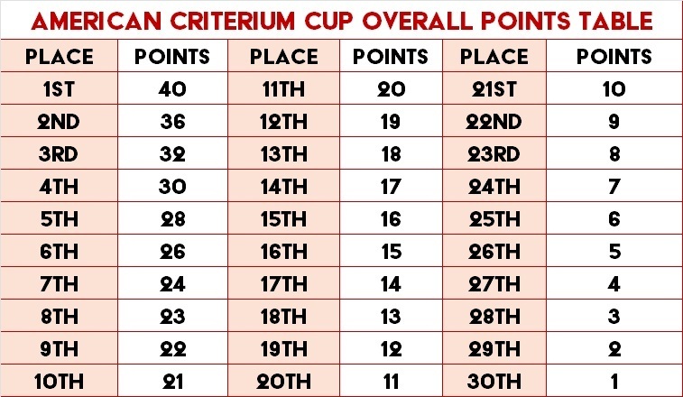 USA Cycling Criterium National Series will follow all American Criterium Cup points and regulations. More information on the series regulations can be found HERE.