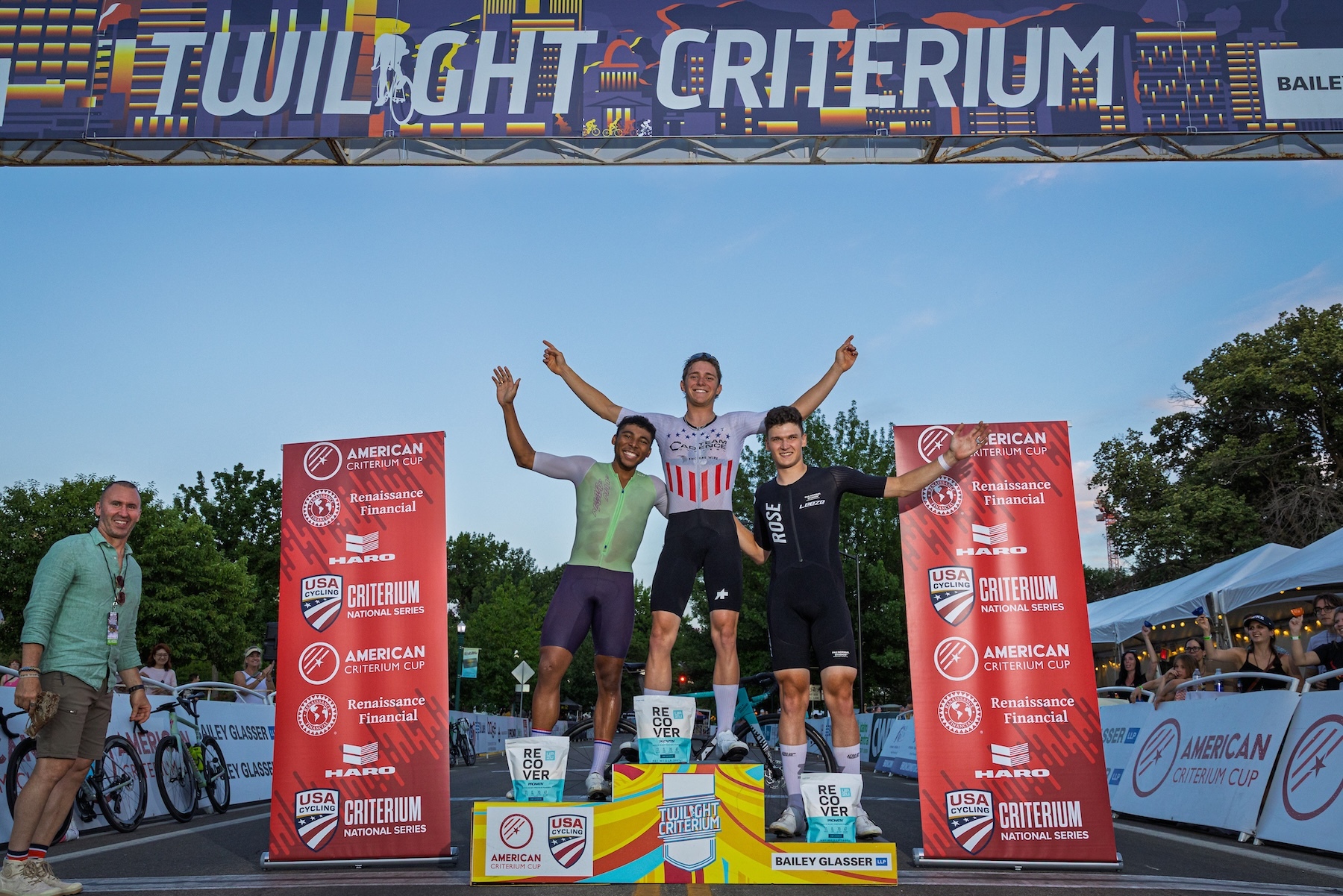 Nevertheless, up ahead Fetzer cruised to his first big victory on the criterium scene, raising his arms well before the finish and soaking in the cheers from a massive crowd. Behind him Frank, unaware of the chaos his team caused behind him, was holding on to a small gap into the final straight. He was just meters away from taking the second spot on the podium before Maurice Ballerstedt and Ama Nsek burst by him with 25 meters left to race to snatch a podium finish from him.